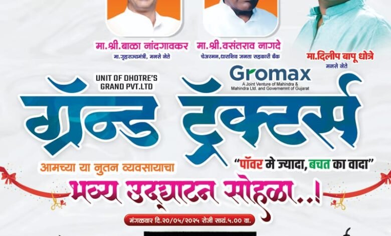 पंढरपूर ( प्रतिनिधी)“धोत्रे ग्रँड प्रायव्हेट लिमिटेड “,या ग्रँड ट्रॅक्टरचे व्यवसायाचे आज मंगळवार दिनांक 20 मे 2025 रोजी सायंकाळी पाच वाजता पंढरपूर येथील अहिल्या चौक पंढरपूर टेंभुर्णी रोड भटुंबरे या ठिकाणी होणार असून उद्घाटन मनसेचे नेते माजी गृहराज्यमंत्री बाळासाहेब नांदगावकर यांच्या शुभहस्ते व ह.भ.प वसंतराव नागदे चेअरमन धाराशिव जनता सहकारी बँक यांच्या अध्यक्षतेखाली हा कार्यक्रम पार पडणार आहे. या कार्यक्रमास मनसे नेते अविनाश अभ्यंकर, आ. वैजिनाथ शिंदे आ. अभिजित पाटील, आ. राजु खरे, माजी नगराध्यक्ष विश्वास शिंदे धाराशिव, चेअरमन कल्याणराव काळे, . बाबु वागसकर,मनसे नेते,.गिरीराज सावंत सेक्रेटरी, JSPM, Puneराजाभाऊ उंबरकर,मनसे नेते, विनायक आण्णा महिंद्रकर,जिल्हाध्यक्ष मनसे, सोलापूर अनिल सावंत व्हाईस चेअरमन, भैरवनाथ शुगर. रॉकी बंगाळे,कॉग्रेस नेते, प्रदिप (भैय्या) पवार,माजी नगरसेवक,अरुणभाऊ कोळी,संस्थापक अध्यक्ष, जय भवानी सामा. संस्था,दगडुशेठ घोडके माजी नगराध्यक्ष, सुनिल सर्वगोड,नेते, आर.पी.आय.,नानासाहेब कदम संस्थापक अध्यक्ष, शिवप्रेमी,. संजय बंदपट्टे,जिल्हा संघटक, शिवसेना,.लक्ष्मण (तात्या) बंदपट्टे,समाजसेवक, अकलुज सुभाष मस्के,भाजपा तालुका अध्यक्ष .अंबादास धोत्रे,मा. नगरसेवक लखन चौगुले,मा. नगरसेवक दत्ता भोसले,अध्यक्ष, मी वडार सामाजिक संघटना,