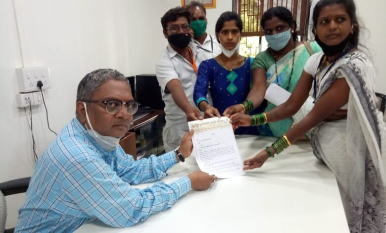 पुरोगामी संघर्ष परिषदेच्यावतीने उपमुख्य कार्यकारी अधिकारी प्रशांत लोखंडे यांना निवेदन देताना सौ स्वाती सौंदडे ,सौ रतन लोखंडे ,सर्जेराव भंडारे इत्यादी