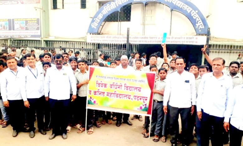 पंढरपूर -श्री दादासाहेब सोमदळे शिक्षण प्रसारक मंडळ पंढरपूर संचलित विवेक वर्धिनी विद्यालय व कनिष्ठ महाविद्यालय पंढरपूर मध्ये ‘स्वातंत्र्याचा अमृत महोत्सव’ अंतर्गत विविध उपक्रम राबवण्यात आले त्यामध्ये प्रशालेतील विद्यार्थ्यांची ‘हर घर तिरंगा‘ प्रभात फेरी काढण्यात आली.यामध्ये विद्यार्थ्यांनी भारत माता की जय, वंदे मातरम्,घर घर तिरंगा ,हर घर तिरंगा ,अशा घोषणा देत आजादी का अमृत महोत्सव निमित्त जनजागृती केली. विद्यार्थ्यांनी हातामध्ये देशभक्तीपर घोषवाक्य, असणारे फलक घेतले होते. ही प्रभात फेरी विद्यार्थी प्रशालेच्या परिसरातील लोक वस्तीमध्ये काढून पालकांना स्वातंत्र्य दिनानिमित्त हर घर तिरंगा अभियानामध्ये सहभागी होण्याचा संदेश याद्वारे देण्यात आला.यासाठी प्रशालेचे प्राचार्य मुंढे यु.आर. पर्यवेक्षक सुनील पाटील , क्रीडा शिक्षक महादेव रणदिवे ,शिवाजी येडवे, राजुभाई मुलाणी, संजय क्षीरसागर, मासाळ एस टी, काळेल पी जी, गुरव एस एच, टकले के एस,सर्व शिक्षक शिक्षकेतर कर्मचारी विद्यार्थी मोठ्या संख्येने सहभागी झाले होते.