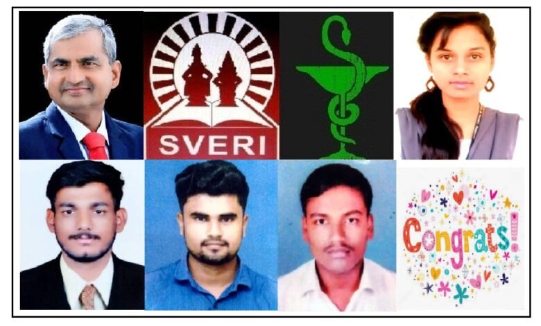 छायाचित्र- संस्थेचे संस्थापक सचिव डॉ. बी. पी. रोंगे, स्वेरी चिन्ह, फार्मसी चिन्ह व कंपनीत निवड झालेले विद्यार्थी अनुक्रमे दिव्या नवले, विश्वजीत पाटील, परवेज मुजावर व सिद्धेश्वर साखरे.
