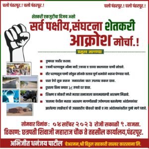 उद्या विठ्ठल परिवार तसेच सर्व पक्षीय, संघटना यांचा आक्रोश शेतकरी मोर्चाचे अयोजन दि.०४सष्टेंबर २०२३रोजी सकाळी९वा छत्रपती शिवाजी महाराज चौक ते पंढरपूर तहसील कार्यालय येथे निवेदन देण्यात येणार आहे.